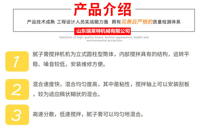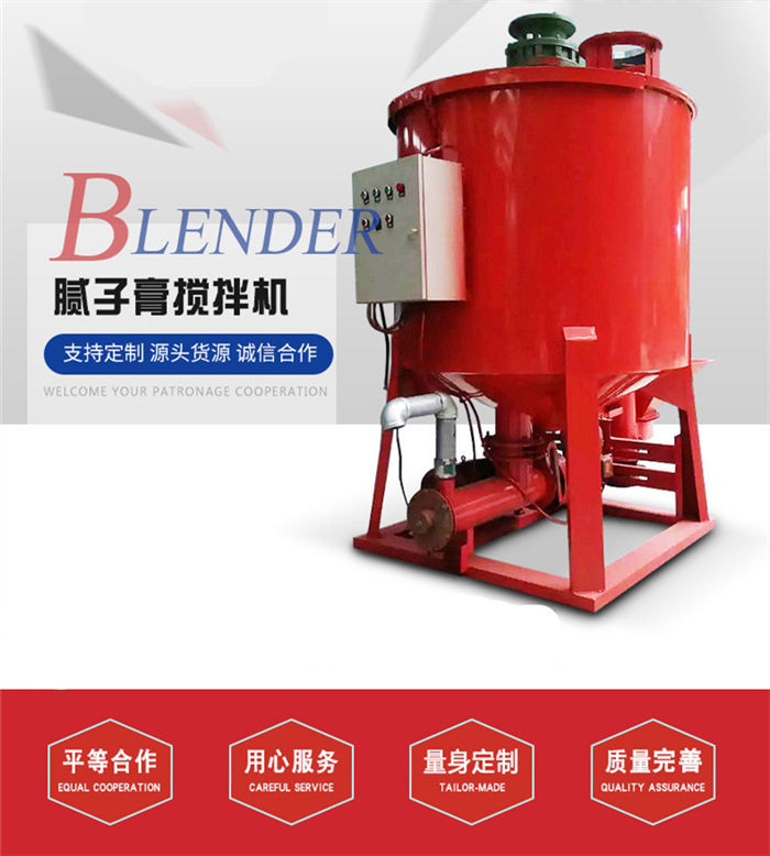 立式膩子膏攪拌機內有高速分散盤,采用高速分散低速攪拌的原理,使物料攪拌較快較均勻,電動出料,輕輕一踩腳踏開關即可放出攪拌好的物料,內加刮板,攪拌葉片與桶壁間隙小,殘留較少,出料較干凈。干粉原材料由螺旋上料機上料,液體可以由水泵上料,使用方便,大大降低了勞動強度,提升了生產效率。可根據不同物料的實際需求定制碳鋼及不銹鋼材料。