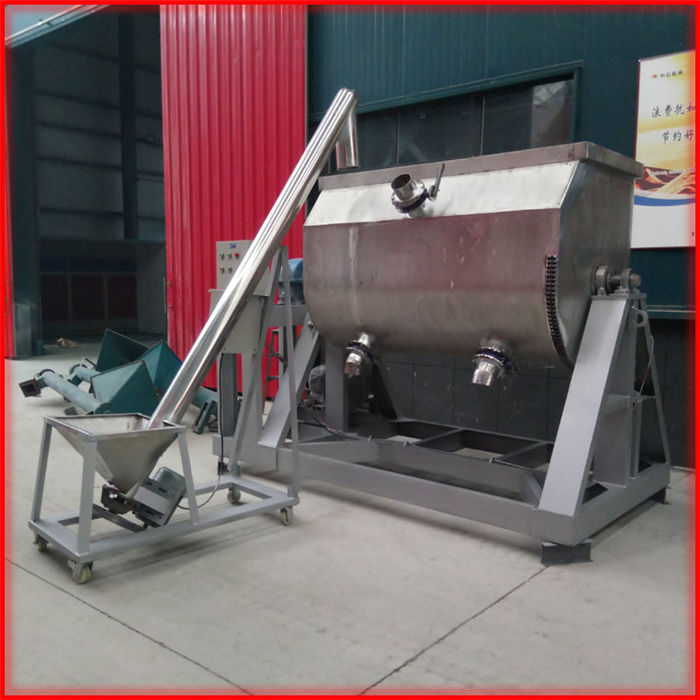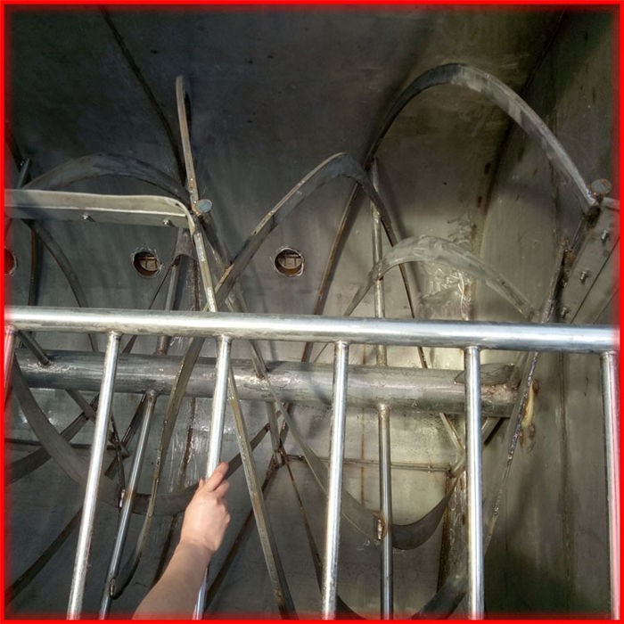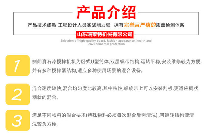 該設備為臥式U型結構,筒體采用碳鋼和不銹鋼(201/301) 材質,內外兩層螺帶交鍇布置,混合逮度快,均勻度高;軸承及攪拌葉片采用碳鋼/不銹鋼錳鋼鑄造材料,槳葉拋光,結實好用;設備的90度翻轉結構,操作時可將殘余物料卸出,清洗工作更方便,降低了勞動強度,提升了生產效率:各部位密封技術好,放料口采用防水蝶閥密封,減少了生產過程中的漏料滴水問題。整套生產線由真石漆攪拌機、控制柜、螺旋提升機(20噸以上設備建議采用斗式提升機)組成,可根據客戶需要,配置合理機型,批次產量最多可達到40T。